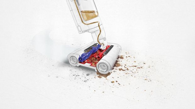 بالكامل. تحتوي كل أسطوانة على ألياف دقيقة عالية الامتصاص بكثافة تبلغ 64,800 خيط لكل سم2.2 يضمن هذا المزيج الفريد من نوعه من الألياف الدقيقة الكثيفة، والمدعوم بتوزيع المياه بطريقة متساوية، امتصاص السوائل المنسكبة، بينما يتم التقاط الأوساخ الجافة والحطام والشعر من خلال ملايين الخيوط. وقام مهندسو دايسون بتركيب الأسطوانات في الجهة الأمامية والخلفية من الجهاز، من أجل إطالة وقت مرورها على كل بقعة، وتحسين القدرة على إزالة البقع بكفاءة وسرعة أكبر.