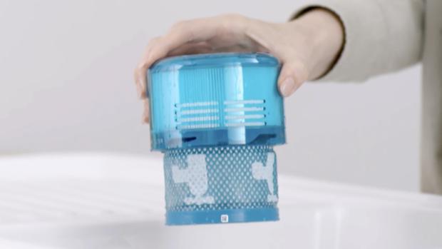 املأ الفلتر بالماء وقم بتغطية كلا الجانبين بيديك، ثم رُجه بلطف. اغسله حتى يصبح الماء المنساب منه نقياً.